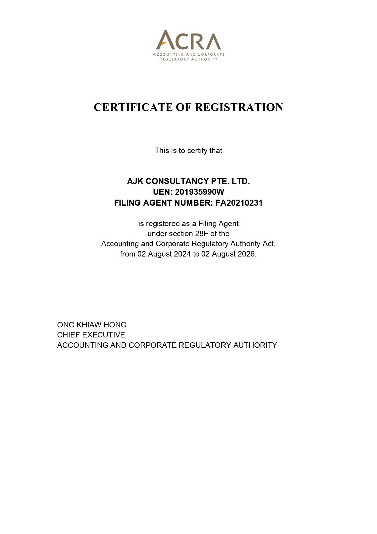 新加坡AJK Consultancy有限公司(英文名 AJK Consultancy Pte Ltd)成立于2019年,新加坡会计与企业管理局(ACRA)持牌企业顾问事务所,在新加坡为本地与海外企业提供一站式的企业顾问服务。